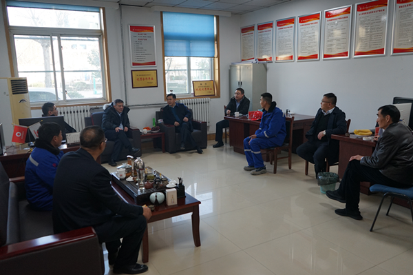 張總一行首先來到分公司駐地在辦公室聽取了公司副總經理劉占中關于平陰分公司2020年度工作開展有關情況匯報,之后對辦公區域生活環境、冬季采暖、項目部人員家庭及經濟收入等方面問題進行調研。