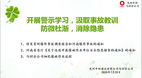 馬村分公司于723日下午在會議室舉行了“開展警示學習,汲取事故教訓,牢筑安全防線”的會議,會議為大家轉發了貴州凱里市舟溪鎮3.19”較大爆炸事故調查報告》及河南欒川縣爆炸事故有關情況、河南省省廳《關于迅速開展爆破作業單位安全隱患排查的通知》。同時為了認真貫徹“安全第一、預防為主”的方針,切實做好現場安全爆破作業,并規范管理使用民用爆炸物品的工作,從根本上消除爆破安全隱患,杜絕爆破事故的發生,實現安全生產,馬村分公司參會人員學習爆破作業安全規程的相關知識。