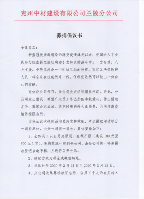 蘭陵分公司下發了《募捐倡議書》,堅持自覺自愿與量力而行的原則,呼吁全體員工積極參與,奉獻愛心,捐款助力抗擊疫情。分公司經理龔士朋同志帶頭捐款,以實際行動做表率,起到很好的模范作用。在龔經理的帶動下,分公司全體員工積極響應,紛紛捐款,每一名員工都獻出一份愛心。