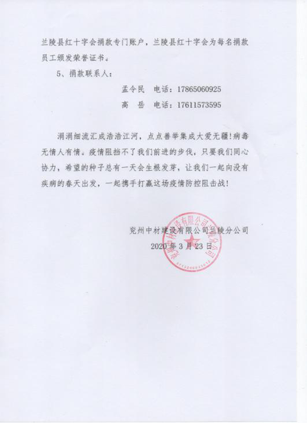 陽春三月,乍暖還寒。全國疫情防控工作取得重大勝果接近尾聲之際,仍有很多人士奮斗在抗疫第一線。災害無情,人間有愛,近日來,蘭陵分公司積極響應公司號召,組織開展為防控新冠肺炎疫情捐款活動,助力新冠肺炎疫情防控工作。