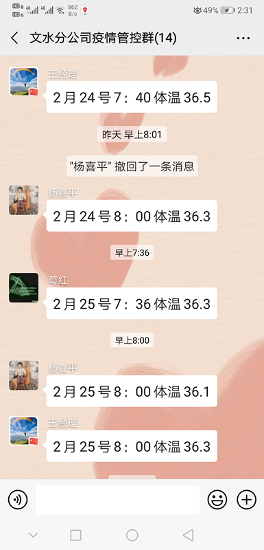 3、利用微信建群,做好公司疫情信息的搜集統(tǒng)計(jì)與分析工作,每日?qǐng)?bào)告體溫由專門負(fù)責(zé)人統(tǒng)計(jì)信息并報(bào)送總公司、業(yè)主、當(dāng)?shù)赜嘘P(guān)部門。