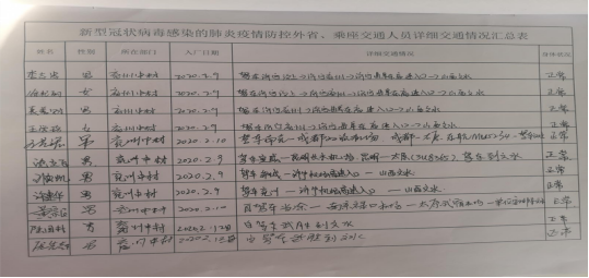8、我們做了員工排查,建立返崗人員登記制度對(duì)返回人員登記,每天微信群詳細(xì)記錄職工身體狀況、假期外出情況、與重點(diǎn)疫區(qū)人員接觸情況等信息;對(duì)每名員工近14天的去向進(jìn)行排查;對(duì)來自或去過疫情重點(diǎn)地區(qū)的員工建立重點(diǎn)監(jiān)控清單,規(guī)勸其留在當(dāng)?shù)貢翰粡?fù)工,鼓勵(lì)員工延遲上班;對(duì)來自或去過疫情重點(diǎn)地區(qū)的員工排查其抵達(dá)時(shí)間,按規(guī)定落實(shí)醫(yī)學(xué)觀察、隔離等措施,確保其隔離觀察14天并經(jīng)體溫檢測正常、無不適癥狀后方可上崗。進(jìn)入崗位工作前自覺接受體溫檢測,體溫正常方可進(jìn)入工作區(qū),并洗手消毒。嚴(yán)格執(zhí)行各項(xiàng)疫情防控要求,建立和落實(shí)復(fù)工上崗前個(gè)人防護(hù)知識(shí)培訓(xùn),多種方式普及傳染病防護(hù)知識(shí),做到有癥狀早發(fā)現(xiàn)、早報(bào)告、早隔離、早治療。