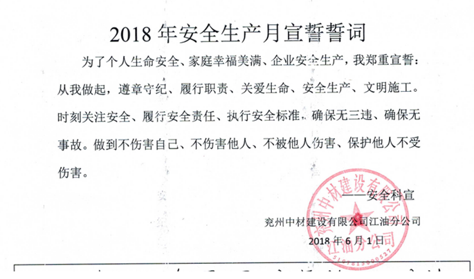 今年6月是全國第17個“安全生產(chǎn)月”, 6月1日,兗州中材江油分公司安全生產(chǎn)月活動啟動儀式在項目部會議室隆重召開,本次活動主題為“生命至上、安全發(fā)展”。項目部領(lǐng)導(dǎo)、員工共計40余人參加了本次安全生產(chǎn)月啟動儀式。 會上,安全科傳達《2018年安全生產(chǎn)月活動實施方案》并對安全工作進行闡述與部署。組織員工觀看安全教育宣傳片,通過對典型真實案例的生動再現(xiàn),使員工真正從思想深處懂得安全,重視安全,時時刻刻想著安全,增強職工安全意識,強化安全理念,提高職工的安全素質(zhì)。項目副經(jīng)理強調(diào),安全是社會經(jīng)濟發(fā)展的需要,是企業(yè)自身發(fā)展的需要,是從業(yè)人員參與勞動的需要。要樹立“紅線意識”,堅決落實崗位責(zé)任;加強安全教育宣傳,定期排查隱患,完善安全體制建設(shè),依法治安、依法作業(yè);堅持“安全第一、預(yù)防為主、綜合治理”的方針,持續(xù)有效推動公司安全生產(chǎn)形勢穩(wěn)定發(fā)展。項目經(jīng)理要求,一是要加強領(lǐng)導(dǎo)、高度重視,正確把握當前安全形勢,突出落實安全責(zé)任主線,深刻認識開展“安全生產(chǎn)月”活動的重要意義;二是要圍繞主題、協(xié)調(diào)推進,大力宣傳黨和國家的安全生產(chǎn)方針政策、法律法規(guī),通過開展一系列安全活動,進一步營造“關(guān)愛生命、關(guān)注安全”的安全氛圍;三是要扎實開展、狠抓落實,以“安全生產(chǎn)月”活動為契機,在保持雙體系有效運行的同時做到統(tǒng)一思想、提高安全意識,為公司安全穩(wěn)定、和諧發(fā)展提供有力保障;四是要強化培訓(xùn)、提升意識,圍繞國家法律法規(guī),開展員工安全教育培訓(xùn),全面提升全員綜合安全素質(zhì)及法制意識,強化依法治企、依規(guī)治企。會議最后,項目部組織全體員工進行安全月宣誓和簽名,安全生產(chǎn)月正式拉開帷幕。