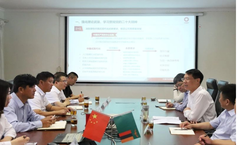 1月20日上午,蔣中文向中材礦山、蘇州中材、中材建設(shè)、智慧工業(yè)等在贊比亞團隊講授主題為“自信自立、守正創(chuàng)新、勇?lián)鷩H化發(fā)展前沿重任”的黨課,并提出以下要求:一是強化理論武裝,充分學(xué)習(xí)貫徹黨的二十大精神。二是牢固樹立戰(zhàn)略思維,確保中材國際發(fā)展戰(zhàn)略在贊比亞有效落實。三是堅持立足屬地發(fā)展,接續(xù)公司國際化發(fā)展偉大事業(yè)。