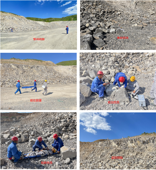 本次應急演練事故假定:由于現場管理人員未發現挖裝區上部已有裂縫的邊坡,汽車駕駛員并將車輛停放在采場+1260平臺靠近邊坡處檢查車輛,未觀察周圍及邊坡穩定情況,突然邊坡坍塌,將汽車駕駛員腿部砸傷,現場員工發現后立即上報現場負責人。